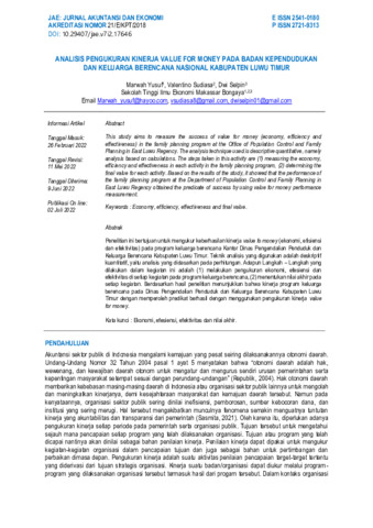 Marwah Yusuf and Valentino Sudiasa and Dwi Selpin (2022) Analisis pengukuran kinerja value for money Pada Badan Kependudukan dan Keluarga Berencana Nasional Kabupaten Luwu Timur. JAE (Jurnal Akuntansi dan Ekonomi), 7 (2): 14. pp. 157-171. ISSN 2721-9313