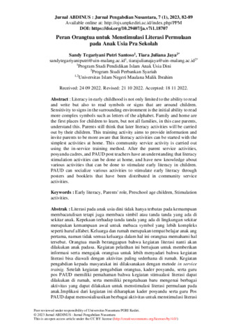 Sandy Tegariyani Putri Santoso and Tiara Juliana Jaya (2023) Peran orangtua untuk menstimulasi literasi permulaan pada anak usia pra sekolah. Jurnal ABDINUS: Jurnal Pengabdian kepada Masyarakat, 7 (1): 9. pp. 82-89. ISSN 2599-0764