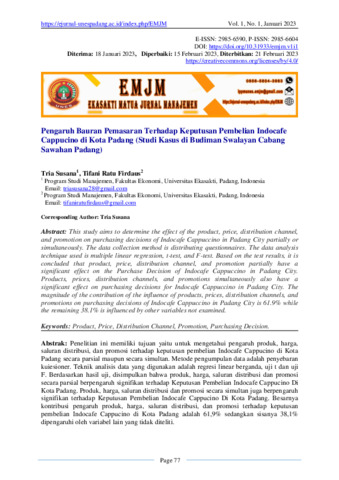 Tria, Susana and Tifani, Ratu Firdaus and Teti, Chandrayanti (2023) Pengaruh bauran pemasaran terhadap keputusan pembelian indocafe cappucino di Kota Padang (studi kasus di Budiman Swalayan cabang Sawahan Padang). Ekasakti Matua Jurnal Manajemen, 1 (1): 10. pp. 77-87. ISSN 2985-6604