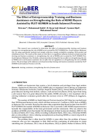 Nirwana, Nirwana and Muhammad, Rakib and M., Ihsan Said Ahmad and Syamsu, Rijal and Muhammad, Hasan (2023) The effect of entrepreneurship training and business assistance on strengthening the role of MSME players assisted by PLUT-KUMKM in South Sulawesi Province. Indonesian Journal of Business and Entrepreneurship Research, 1 (1): 1. pp. 1-10. ISSN 2985-4636