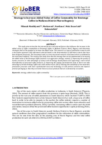 Hikmah, Maulidyanti and Marhawati, Marhawati and Nurdiana, Nurdiana and Muh., Ihsan Said and Rahmatullah, Rahmatullah (2023) Strategy to increase added value of coffee commodity for Bentenge Coffee in Mallawa District Maros Regency. Indonesian Journal of Business and Entrepreneurship Research, 1 (1): 4. pp. 33-44. ISSN 2985-4636