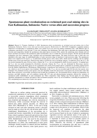 Lia Hapsari and Trimanto and Sugeng Budiharta (2020) Spontaneous plant recolonization on reclaimed post-coal mining sites in East Kalimantan, Indonesia: native versus alien and succession progress. Biodiversitas, 21 (5). pp. 2003-2018. ISSN 2085-4722