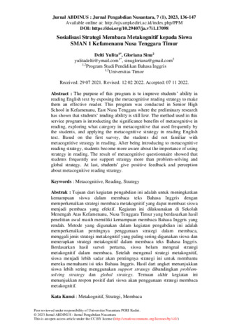 Delti Yulita and Gloriana Sinu (2023) Sosialisasi strategi membaca metakognitif kepada siswa SMAN 1 Kefamenanu Nusa Tenggara Timur. Jurnal ABDINUS: Jurnal Pengabdian kepada Masyarakat, 7 (1): 15. 136 -147. ISSN 2599-0764