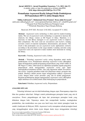 Sidhiq Andriyanto and Muhammad Setya Pratama and Rossa Julia Dewa (2023) Pemanfaatan augmented reality sebagai media pembelajaran di perpustakaan SDN 12 Jebus Bangka Barat. Jurnal ABDINUS: Jurnal Pengabdian kepada Masyarakat, 7 (1): 18. pp. 166-172. ISSN 2599-0764