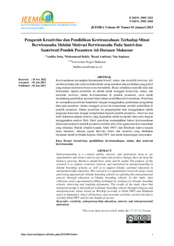 Andika, Isma and Muhammad, Rakib and Rusni, Andriani and Ina, Septiana (2023) Pengaruh kreativitas dan pendidikan kewirausahaan terhadap minat berwirausaha melalui motivasi berwirausaha pada santri dan santriwati Pondok Pesantren Ad-Daraaen Makassar. Journal of Economics, Entrepreneurship, Management Business and Accounting, 1 (1): 1. pp. 1-11. ISSN 2985-3222