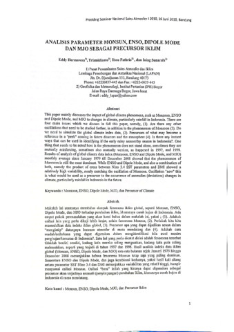 Makalah ini utamanya membahas dampak fenomena iklim global, seperti MonsunENSO, Dipole Mode, dan MIO terhadap perubahan iklimkhususnya curah hujan di IndonesiaAda empat pokok permasalahan yang akan kami bahas dalam makalah ini, yakni; (1)Adakah osilasi lain yang perlu dikaji lebih lanjut, selain fenomena Monsun, (2). Perlukah kita kita memodelkan data indeks iklim global(3). Precursor apa yang dapat dijadikan acuan dalam "mengintip datangnya bencana atmosfer di masa mendatang dan (4)Adakah cara mudal/sederhana yang dapat digunakan dalam mengidentifikasi bila awal musim penghujan/kemarau di Indonesia?Satu hal yang perlu dicatat disini adalah fenomena tersebut tidaklah berdiri sendiri, kadang kala mereka saling menguatkankadang kala pula saling melemahkan, seperti yang terjadi di tahun 1997 dan 1998Hasil analisis indeks data iklim global (Monsun, ENSO, Dipole Mode, dan MJO) rata-rata bulanan sejak Januari 1979 hingga Desember 2008 menunjukkan bahwa fenomena Monsun tetap saja yang paling dominan Sementara ENSO dan Dipole Mode, dan juga kombinasi keduanya, yakni hasil kali silang antara parameter SST Nino 3.4 dan DMI menunjukkan variabilitas yang relatif tinggihampir menyamai asilasi Monsun. Osilasi "baru inilah yang kiranya dapat digunakan sebagai precursor akan terjadinya anomali (penyimpangan) perubatan iklimkhususnya curah hujan di Indonesia di masa mendatang.