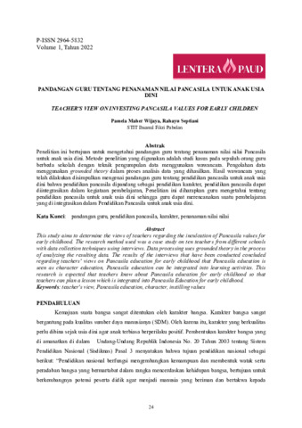 Pamela, Maher Wijaya and Rahayu, Septiani (2022) Pandangan guru tentang penanaman nilai Pancasila untuk anak usia dini. Lentera Paud: Islamic Education and Counseling Journal, 1 (1): 4. pp. 24-29. ISSN 2964-5832