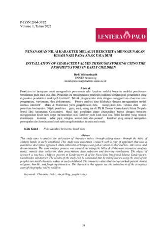 Budi, Widyaningsih (2022) Penanaman nilai karakter melalui bercerita menggunakan kisah nabi pada anak usia dini. Lentera Paud: Islamic Education and Counseling Journal, 1 (1): 6. pp. 39-49. ISSN 2964-5832