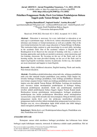| Uncontrolled Keywords: | Media flash card, Pembelajaran bahasa Inggris, Pendidikan usia dini, Pendidikan non-formal, Early childhood education, English learning, Flash card media, Non-formal education, Flash cards, Education, Kindergarten |