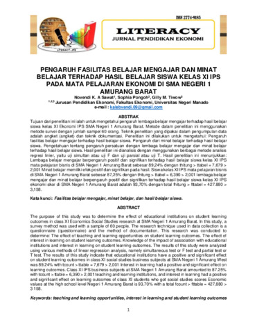 Novendi, K. A Sawat and Sophia, Pongoh and Gilly, M. Tiwow (2021) Pengaruh fasilitas belajar mengajar dan minat belajar terhadap hasil belajar siswa kelas XI IPS pada mata pelajaran ekonomi di SMA Negeri 1 Amurang barat. Literacy: Jurnal Pendidikan Ekonomi, 2 (1). pp. 1-15. ISSN 2774-9185