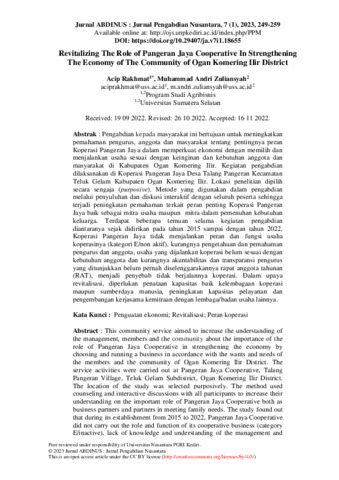 Acip Rakhmat and Muhammad Andri Zuliansyah (2023) Revitalizing the role of Pangeran Jaya cooperative in strengthening the economy of the community of Ogan Komering Ilir District. Jurnal ABDINUS: Jurnal Pengabdian kepada Masyarakat, 7 (1): 26. pp. 249-259. ISSN 2599-0764