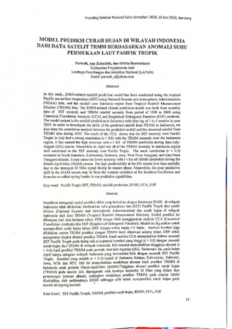 Penelitian mengenai model prediksi iklim yang berkaitan dengan fenomena ENSO di wilayah Indonesia telah dilakukan berdasarkan suhu permukaan laut (SST) Pasifik Tropik dari satelit NOAA (National Oceanic and Atmospheric Administration) dan curah hujan di wilayah Indonesia dari data TRMM (Tropical Rainfall Measurement Mission)Model prediksi ini dibangun dari data bulanan tahun 1998 hingga 2008 menggunakan analisis CCA (Canonical Correlation Analysis) dan EOF (Emphirical Orthogonal Function). Model ini digunakan untuk memprediksi curah hujan tahun 2009 dengan waktu tunda 1-5 bulanAnalisis korelasi juga dilakukan antara TRMM prediksi dengan TRMM hasil observasi selama tahun 2009 untuk mengetahui tingkat akurasi prediksi TRMM. Hasil analisis CCA menunjukkan bahwa anomali SST Pasifik Tropik pada bulan Juli mempunyai korelasi yang tinggi (r> 0.8) dengan anomali curah hujan dari TRMM di wilayah Indonesia. Hal tersebut menyebabkan tingginya akurasi (r > 0.8) hasil prediksi TRMM pada periode Juni-Juli-Agustus (JJA)Sementara itu, pada bulan April hanya sebagian wilayah Indonesia yang berkorelasi baik dengan anomali SST Pasifik TropikKorelasi yang rendah (r< 0.5) terjadi di Sumatera Selatan, Kalimantan, Sulawesi, Jawa, NTB dan NTT. Hal ini menyebabkan rendahnya akurasi hasil prediksi TRMM di Indonesia pada periode Maret-April-Mei (MAM) Tingginya akurasi prediksi curah hujan (TRMM) pada musim JJA dipengaruhi oleh kuatnya intensitas El Nino yang dalam fase pematangan (mature phase)sedangkan rendahnya prediksi TRMM pada musim MAM disebabkan oleh melemahnya ENSO sehingga sulit untuk memprediksi curah hujan pada musim ini (spring barrier).