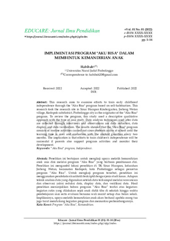 Habibah, Habibah (2022) Implementasi program aku bisa dalam membentuk kemandirian anak usia dini. Educare: Jurnal Ilmu Pendidikan, 1 (1): 1. pp. 1-14. ISSN 2964-2310