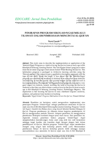 Nurul, Janah (2022) Penerapan program sekolah + ngaji melalui tilawati dalam pembiasaan mencintai Alquran. Educare: Jurnal Ilmu Pendidikan, 1 (1): 6. pp. 69-80. ISSN 2964-2310