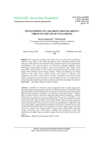 Nurul, Islamiyah and Elok, Farida (2022) Development of children's motor ability through the use of vlog media. Educare: Jurnal Ilmu Pendidikan, 1 (2): 1. pp. 81-91. ISSN 2964-2310