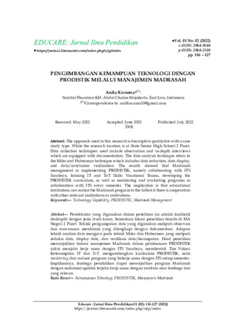 Anita, Kusuma (2022) Pengembangan kemampuan teknologi dengan prodistik melalui manajemen madrasah. Educare: Jurnal Ilmu Pendidikan, 1 (2): 4. pp. 116-127. ISSN 2964-2310