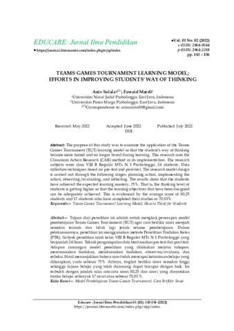 Anis, Sulala and Fawaid, Mardi (2022) Teams games tournament learning model: efforts in improving students' way of thinking. Educare: Jurnal Ilmu Pendidikan, 1 (2): 6. pp. 143-156. ISSN 2964-2310