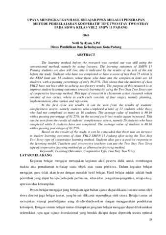 Netti Syofyan (2022) Upaya meningkatkan hasil belajar PPKN melalui penerapan metode pembelajaran kooperatif tipe two stay two stray pada siswa kelas VIII.2 SMPN 11 Padang. Jurnal Pendidikan, 2 (1): 4. pp. 19-24. ISSN 2962-4568