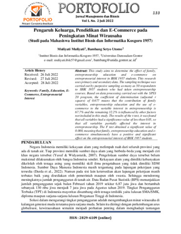 Muliyati, Muliyati and Bambang, Setyo Utomo (2022) Pengaruh keluarga, pendidikan dan E-Commerce pada peningkatan minat Wirausaha (Studi pada Mahasiswa Institut Bisnis dan Informatika Kosgoro 1957). Jurnal Portofolio, 1 (2): 10. pp. 133-143. ISSN 2829-6109