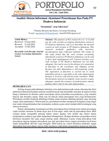 Nuramdani, Nuramdani and Asep, Suherman (2022) Analisis sistem informasi akuntansi penerimaan sas pada PT Dealova Indonesia. Jurnal Portofolio, 1 (2): 2. pp. 63-71. ISSN 2829-6109