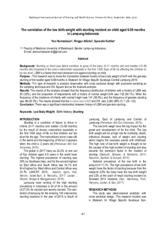 Yesi Nurmalasari and Ringgo Alfarisi and Syawalia Kartika (2019) The correlation of the low birth weight with stunting incident on child aged 6-59 months in Lampung-Indonesia. Malahayati International Journal of Nursing and Health Science, 2 (2): 2. pp. 47-51. ISSN 2620-9152