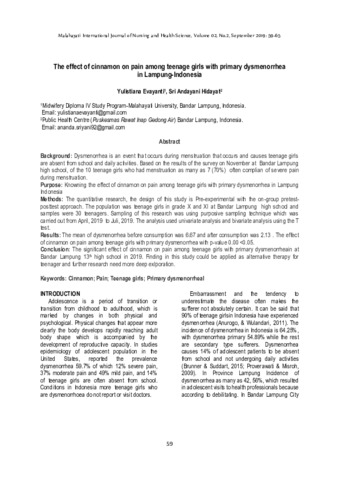 Yulistiana Evayanti and Sri Andayani Hidayat (2019) The effect of cinnamon on pain among teenage girls with primary dysmenorrhea in Lampung-Indonesia. Malahayati International Journal of Nursing and Health Science, 2 (2): 4. pp. 59-65. ISSN 2620-9152
