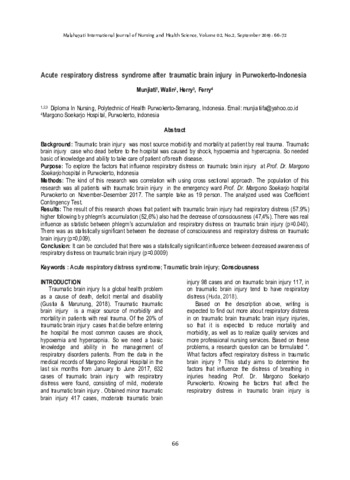 Munjiati and Walin and Herry and Ferry (2019) Acute respiratory distress syndrome after traumatic brain injury in Purwokerto-Indonesia. Malahayati International Journal of Nursing and Health Science, 2 (2): 5. pp. 66-72. ISSN 2620-9152