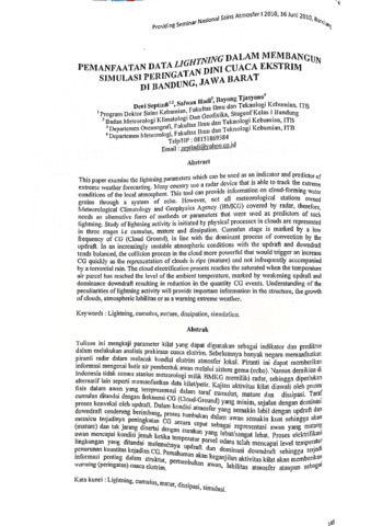 Deni Septiadi and Safwan Hadi and Bayong Tjasyono (2010) Pemanfaatan data lightning dalam membangun simulasi peringatan dini cuaca ekstrim di Bandung, Jawa Barat. In: "Seminar Nasional Sains Atmosfer 2010" Kontribusi Sains Atmosfer dalam menghadapi Perubahan Iklim Indonesia, 16 Juni 2010, Bandung.