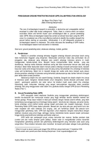 Ida Bagus Putu Prajna, Yogi (2009) Penggunaan Ground Penetrating Radar (GPR) dalam penelitian arkeologi. Naditira Widya, 3 (2): 4. pp. 118-126. ISSN 1410 - 0932