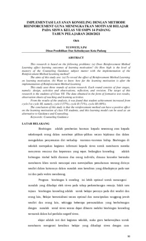 Yusweti (2022) Implementasi layanan konseling dengan methode reinforcement guna meningkatkan motivasi belajar pada siswa kelas VII SMPN 14 Padang Tahun Pelajaran 2020/2021. Jurnal Pendidikan, 2 (1): 16. pp. 90-94. ISSN 2962-4568