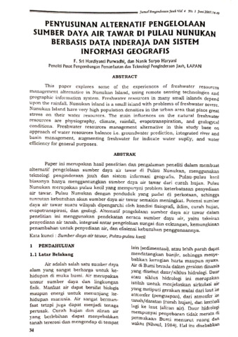 Paper ini merupakan hail penelitian dan pengalaman peneliti dalam membuat alternatif pengelolaan sumber daya air tawar di Pulau Nunukan, menggunakan teknologi penginderaan jauh dan sistem informasi geografis. Pulau-pulau kecil biasanya hanya menggantungkan sumber daya air tawar dari curah hujan. Pulau Nunukan merupakan pulau kecil yang mempunyai problem keterbatasan penyediaan air tawar. Pulau Nunukan dengan penduduk yang padat di perkotaan, schungga tuntutan kebutuhan akan sumber daya air tawar semakin meningkat. Potensi sumber daya air tawar suatu wilayah dipengaruhi oleh kondisi fisiografi, iklim, curah hujan, evapotranspirasi, dan geologi. Alternatif pengelolaan sumber daya air tawar dalam penelitian ini menggunakan pendekatan neraca sumber daya air, yaita taksiran penyediaan air tanah, integrasi antar pengelolaan sungai dan celungan, kemunglanan penambahan untuk penyediaan air, dan efisiensi kebutuhan penggunaannya.