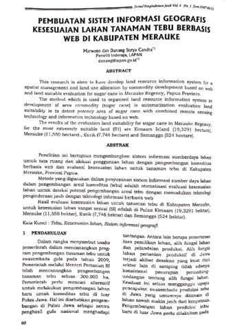 Marwoto, Marwoto and Danang, Surya Candra (2007) Pembuatan sistem informasi geografis kesesuaian lahan tanaman tebu berbasis web di Kabupaten Merauke. Jurnal Penginderaan Jauh dan Pengolahan Data Citra Digital, 4 (1): 6. pp. 60-71. ISSN 1412-8098