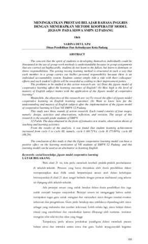 Sarina Devi (2022) Meningkatkan prestasi belajar bahasa inggris dengan menerapkan metode kooperatif model jigsaw pada siswa SMPN 12 Padang. Jurnal Pendidikan, 2 (1): 18. pp. 102-108. ISSN 2962-4568