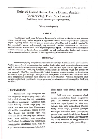 Bencana banjir yang menyebabkan kerusakan terbesar dapat diestimasi daerah penyebarannya. Analisis geomorfologi menggunakan citra Landsat dimaksudkan untuk mengestimasi daerah rentan banjir di daerah Jakarta-Bogor-Tangerang-Bekasi. Guna mencapai tujuan tersebut diperlukan klasifi-kasi unit bentuk lahan. Data yang digunakan adalah Landsat-TM didukung dengan peta geologi dan peta topografi. Klasifikasi bentuk lahan ole Voskuil digunakan untuk menentukan unit bentuk lahan, berdasarkan aspek geomorfologi. Hasil penelitian menuniukkan bahwa klasifikasi bentuklahan detail dapat mengestimasi kerentanan banjir pada tiap-tiap unit bentuklahan. Penelitian selanjutnya untuk menggabungkan hasil penelitian ini dengan parameter lain disarankan untuk mendapatkan hasil yang lebih baik.