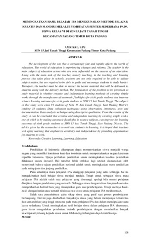 Amrizal (2022) Meningkatkan hasil belajar IPA menggunakan metode belajar kreatif dan mandiri melalui pembuatan senter sederhana pada siswa kelas VI di SDN 15 Jati Tanah Tinggi Kecamatan Padang Timur Kota Padang. Jurnal Pendidikan, 2 (1): 19. pp. 108-111. ISSN 2962-4568