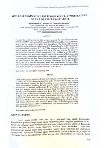 Untuk kajian potensi angin daerah Bali, telah dilakukan simulasi angin Uluwatu Bali (8°50'LS, 115°07'BT) dengan menggunakan model atmosfer WRF (Weather Reseach and Forecasting)Simulasi ini hasil dowscaling one-way nesting 4 tahap dengan initial dan boundary condition dari data atmosfer global / reanalisis NCEP/NCAR resolusi grid 2,5 menjadi grid horisontal 2,1 km. Tahap-1 (resolusi grid $7,6 km x 57,6 km) meliputi seluruh wilayah Indonesia; tahap-2 (resolusi grid 19,2 km x 19.2km) meliputi Sumatera bagian selatan, Jawa, Bali, Nusa Tenggara, Pulau Timur dan sebagian Kalimantan dan Sulawesi, tahap-3 (resolusi grid 6.4 km x 6,4 km) meliputi Jawa, Bali dan Nusa Tenggara, terakhir tahap-4 (resolusi grid 2,1 km x 2,1 km) meliputi seluruh Pulau Bali. Arah dan kecepatan angin lokasi Uluwatu - Pulau Bali antara 00UTC 01 Juli 2008 dan 00UTC 02 Juli 2008 dapat disimulasikan dengan baik oleh model atmosfer WRI resolusi 2,1km x 2,1 km. Perbandingan angin antara pengamatan dan simulasi adalah kecepatan angin rata-rata pengamatan 5,80 m's arah 185 dan model 5,76 m's arah 131.