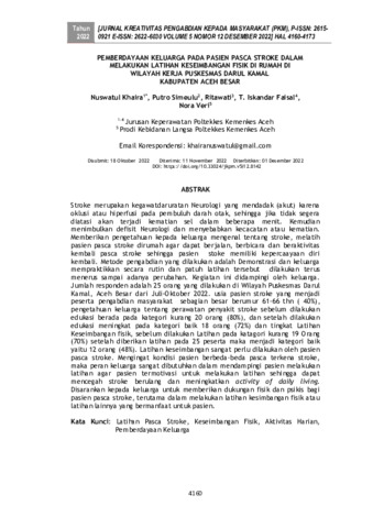 Nuswatul Khaira and Putro Simeulu and Ritawati and T. Iskandar Faisal and Nora Veri (2022) Pemberdayaan keluarga pada pasien pasca stroke dalam melakukan latihan keseimbangan fisik di rumah di wilayah kerja PUSKESMAS Darul Kamal Kabupaten Aceh Besar. Jurnal Kreativitas Pengabdian kepada Masyarakat, 5 (12): 1. pp. 4160-4173. ISSN 2615-0921