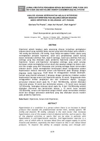 Gloriana Tio Fhania and Intan Asri Nurani and Diah Argarini (2022) Analisis asuhan keperawatan melalui intervensi senam anti-hipertensi pada keluarga dengan diagnosa medis hipertensi di Kelurahan Jati Padang. Jurnal Kreativitas Pengabdian kepada Masyarakat, 5 (12): 3. pp. 4179-4185. ISSN 2615-0921