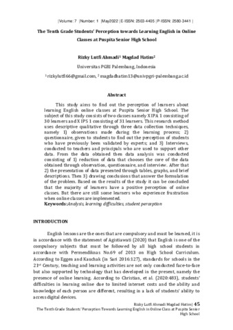 Rizky, Lutfi Ahmadi and Magdad, Hatim (2022) The Tenth grade students’ perception towards learning English in online classes at Puspita Senior High School. English Education : Journal of English Teaching and Research, 7 (1): 5. pp. 45-51. ISSN 2503 – 4405
