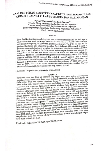 Kebakaran hutan dan lahan di Indonesia yang terjadi setiap tahun sering menjadi pusat perhatian dunia karena luasan hutan tropis Indonesia menduduki peringkat ketiga terluas di dunia setelah Brasil dan Republik Demokrasi Kongo. Penyebab utama kebakaran hutan dan lahan adalah faktor manusia terkait dengan pembukaan lahan bagi usaha-usaha pertanian, perkebunan dan kehutanan. Selain faktor manusia, kebakaran hutan dan lahan di Indonesia dipengaruhi oleh fenomena iklim ekstrim ENSO (El Nino and the Southern Oscillation). Penelitian ini bertujuan untuk mengetahui pola distribusi hotspot indikasi kebakaran hutan dan lahan secara bulanan di Indonesia dari data MODIS periode 2006-2009 serta kaitannya dengan fenomena ENSO dan menganalisis hubungan antara hotspot dengan curah hujan dari data TRMM di wilayah rawan kebakaran hutan dan lahan, yaitu di Provinsi Riau dan Kalimantan Tengah. Dari penelitian ini diketahui bahwa akumulasi hotspot tertinggi terjadi pada tahun 2009, yaitu mencapai 39.422 hotspot, kemudian pada tahun 2006 sebesar 35.134 hotspot. Akumulasi hotspot tertinggi di Provinsi Riau terjadi pada bulan Februari/Maret dan bulan Juli/Agustus, sedangkan di Kalimantan Tengah terjadi pada bulan Agustus/September. Penurunan curah hujan berpengaruh terhadap peningkatan hotspot, yaitu diindikasikan dengan terjadinya peningkatan jumlah hotspot secara nyata pada saat terjadinya fenomena ENSO di tahun 2002, 2004, 2006 dan 2009. Namun curah hujan bukan merupakan faktor utama yang menyebabkan tinggi atau rendahnya hotspot di suatu lokasi. Korelasi antara hotspot dengan curah hujan adalah 0.50 -0.63.
