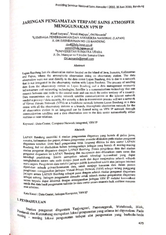 Rizal Suryana and Wendi Harjupa and Ori Novanda (2010) Jaringan pengamatan terpadu sains atmosfer menggunakan VPN IP. In: "Seminar Nasional Sains Atmosfer 2010" Kontribusi Sains Atmosfer dalam menghadapi Perubahan Iklim Indonesia, 16 Juni 2010, Bandung.