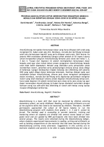 David Manafe and Ferdinandus Jonda and Helena Elni Nembo and Adventus Benge and Lidwina Jewati and Stefanus I. Tobi Sogen (2022) Program amancalistung untuk meningkatkan kemampuan membaca menulis dan berhitung dengan siswa-siswi di SD Inpres Sulamu. Jurnal Kreativitas Pengabdian kepada Masyarakat, 5 (12): 10. pp. 4259-4267. ISSN 2615-0921