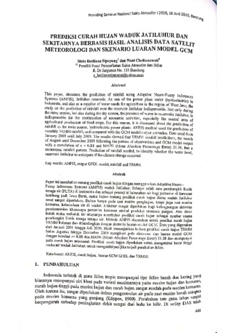 Paper ini membahas tentang prediksi curah hujan dengan menggunakan Adaptive Neuro- Fuzzy Inferences Systems (ANFIS) waduk Jatiluhur. Sebagai salah satu pembangkit listrik tenaga air (PLTA) di Indonesia dan sebagai pensuplai kebutuhan air bagi pertanian di kawasan lumbung padi Jawa Barat, maka kajian tentang prediksi curah hujan diatas waduk Jatiluhur amat sangat diperlukan. Bukan hanya pada saat musim penghujan, tetapi juga saat musim kemarau, keberadaan air di waduk Jatiluhur sangat diperlukan bagi kelangsungan aktivitas perekonomian khususnya pertanian kawasan sentral produksi tanaman pangan. Atas dasar itulah maka makalah ini utamanya membahas prediksi curah hujan sebagai sumber utama pembangkit listrik tenaga tenaga air. Metode ANFIS digunakan untuk prediksi curah hujan TRMM bulanan dan dibandingkan dengan skenario luaran model GCM. Data yang digunakan dari Januari 2001 hingga Juli 2009. Hasil menunjukkan bahwa prediksi curah hujan TRMM bulan Agustus hingga Desember 2009 mengikuti pola observasi dan luaran model GCM dengan korelasi - 0.88 dan MAPE (Mean Absolute Percentage Error) 31.38 dan mempunyai pola curah hujan monsunal. Prediksi curah hujan diperlukan untuk mengetahui besar tinggi muka air waduk Jatiluhur, untuk mengantisipasi jika terjadi perubahan iklim.