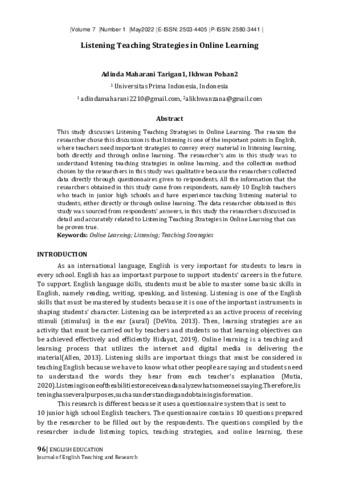 Adinda, Maharani Tarigan and Ikhwan, Pohan (2022) Listening teaching strategies in online learning. English Education : Journal of English Teaching and Research, 7 (1): 10. pp. 96-107. ISSN 2503 – 4405