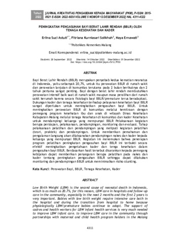 Erlina Suci Astuti and Fitriana Kurniasari Solikhah and Naya Ernawati (2022) Peningkatan pengasuhan Bayi Berat Lahir Rendah (BBLR) oleh tenaga kesehatan dan kader. Jurnal Kreativitas Pengabdian kepada Masyarakat, 5 (12): 15. pp. 4311-4322. ISSN 2615-0921