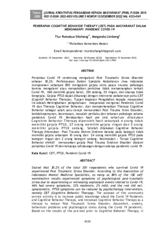 Tiur Romatua Sitohang and Marganda Limbong (2022) Penerapan cognitive behavior therapy (CBT) pada masyarakat dalam menghadapi pandemic covid-19. Jurnal Kreativitas Pengabdian kepada Masyarakat, 5 (12): 17. pp. 4333-4341. ISSN 2615-0921