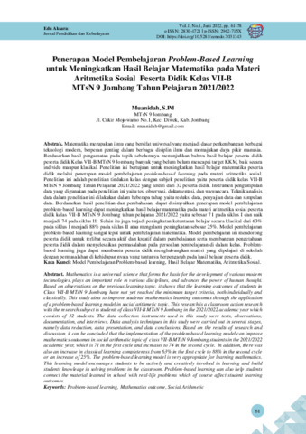 Muanidah (2022) Penerapan model pembelajaran problem-based learning untuk meningkatkan hasil belajar matematika pada materi aritmetika sosial peserta didik kelas VII-B MTsN 9 Jombang tahun pelajaran 2021/2022. Edu Aksara: Jurnal Pendidikan dan Kebudayaan, 1 (1): 5. pp. 61-78. ISSN 2962-715X
