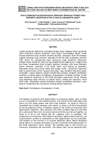 Nina Sumarni and Udin Rosidin and Umar Sumarna and Witdiawati and Iwan Sholahuddin and Rohmahalia M.Noor (2022) Upaya peningkatan kewaspadaan terhadap serangan stroke pada penderita hipertensi di rw 05 dan 06 Sukamentri Garut. Jurnal Kreativitas Pengabdian kepada Masyarakat, 5 (12): 25. pp. 4402-4409. ISSN 2615-0921