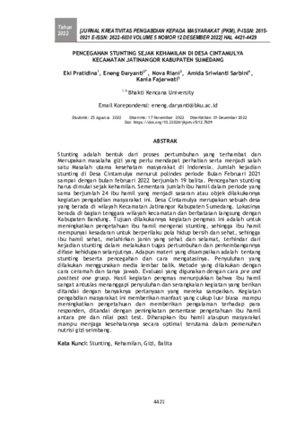 Eki Pratidina and Eneng Daryanti and Nova Riani and Amida Sriwianti Sarbini and Kania Fajarwati (2022) Pencegahan stunting sejak kehamilan di Desa Cintamulya Kecamatan Jatinangor Kabupaten Sumedang. Jurnal Kreativitas Pengabdian kepada Masyarakat, 5 (12): 27. pp. 4421-4429. ISSN 2615-0921