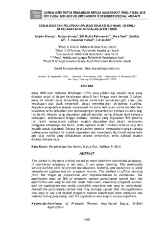 Aripin Ahmad and Abdurrahman and Siti Mutia Rahmawati and Nora Veri and Emilda AS and T. Iskandar Faisal and Cut Mutiah (2022) Sosialisasi dan pelatihan aplikasi edukasi ibu hamil (SI-EMIL) di Kecamatan Nurussalam Aceh Timur. Jurnal Kreativitas Pengabdian kepada Masyarakat, 5 (12): 28. pp. 4462-4472. ISSN 2615-0921